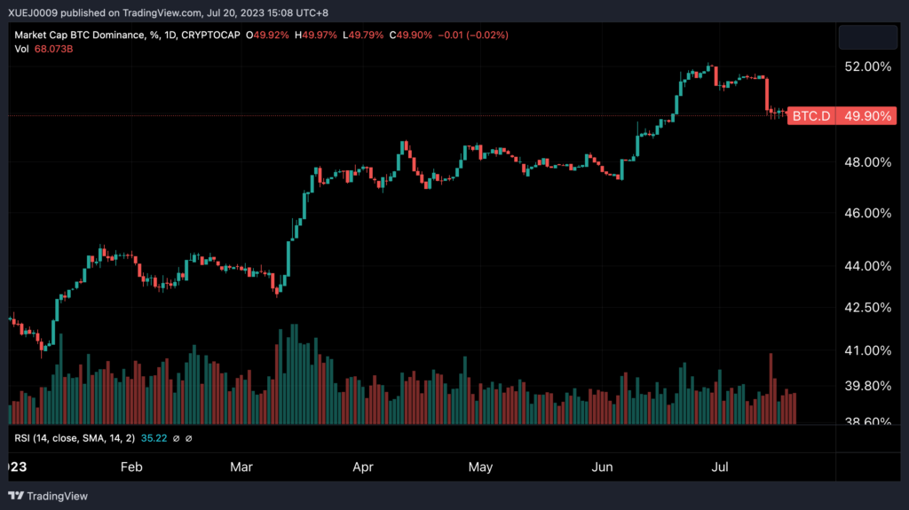 This week, XRP continued to benefit from favorable rulings in regulatory disputes, leading to several exchanges such as Coinbase, Kraken, and Bitstamp reinstating XRP trading. The trading volume and open interest of XRP futures contracts have seen a substantial increase as well. The recent bullish sentiment also spread to other tokens like COMP, XLM, ADA, SOL, etc. According to TradingView data, the Bitcoin Dominance Index, which measures Bitcoin’s share in the total cryptocurrency market cap, dropped from a high of 52% at the end of June to 49.8%, nearing its lowest level in almost a month.