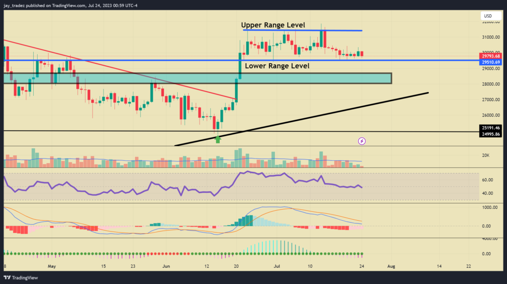 BTC’s recent price action has been uneventful, even amidst positive market sentiment from XRP’s legal win and discussions about BTC on CNBC. However, the cryptocurrency remains anchored near its lower support at $29,500, indicating weakness in the market. The current state of equilibrium between buyers and sellers suggests a cautious and uncertain sentiment, as positive news fails to drive significant price increases. Investors should exercise caution and carefully consider the potential for further downward movement or a potential rebound from the support level, as the market continues to show signs of indecisiveness.