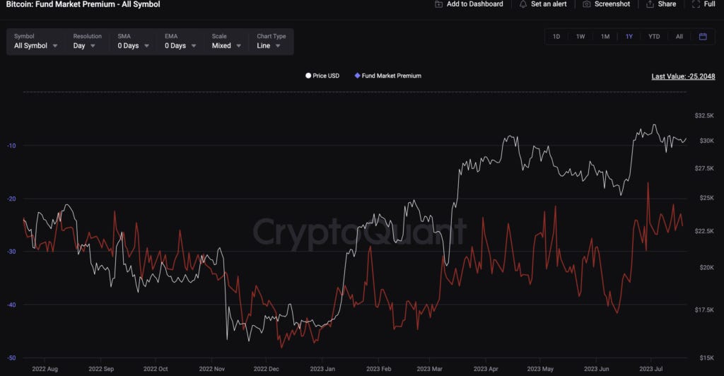 The premium of Bitcoin trusts over Bitcoin spot has been steadily increasing in the past few months.