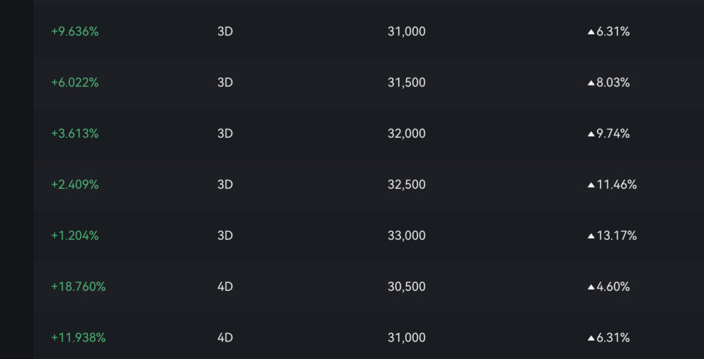 We hope that everyone followed our advice to take profits on a portion of their Bitcoin position. Today, we witnessed a break of the lower range, and there is a possibility of further downward continuation. To mitigate risks and generate additional BTC, we recommend continuing to sell covered calls. Considering the low probability of the price increasing significantly, you can select a product with a short expiration date of 3 days and a target price of $31,000, which could offer an annualized return of 10%. This strategy aims to capitalize on the current market conditions while managing potential downside risks.
