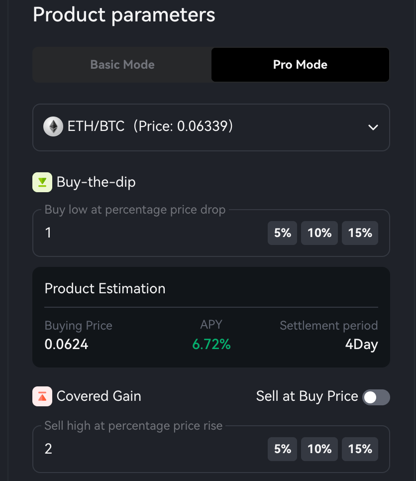 For this strategy, we suggest using a 1% decline as the Buy-the-dip parameter and a 2% increase for the Covered Gain. This approach allows for generating interest while the price remains relatively stable and captures gains from ETH's outperformance when there's a spike in its price. The flying wheel strategy aims to take advantage of market conditions, providing potential benefits during periods of sideways price action and potential ETH price surges.
