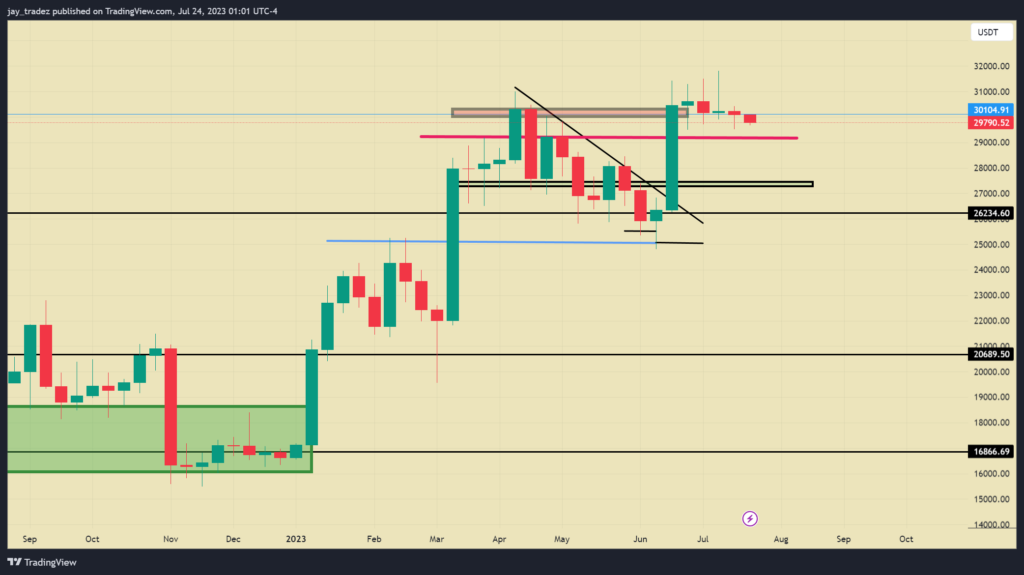 On the weekly time frame, there are significant levels to consider within the weekly cluster: $29,200 and $27,500, which have been frequently tested. Between these levels, there’s a crucial $28,000 whole number level that may attract buyer interest. In the event of a breakdown, it’s advisable to wait for a clear failed breakdown of support or observe how the market reacts at the deeper levels, namely $28,000 or $27,500. Currently, it’s more prudent to wait for a range expansion rather than trading within the range itself. While awaiting the expansion, it’s recommended to set dual investment orders at those deeper support levels to capitalize on potential opportunities.