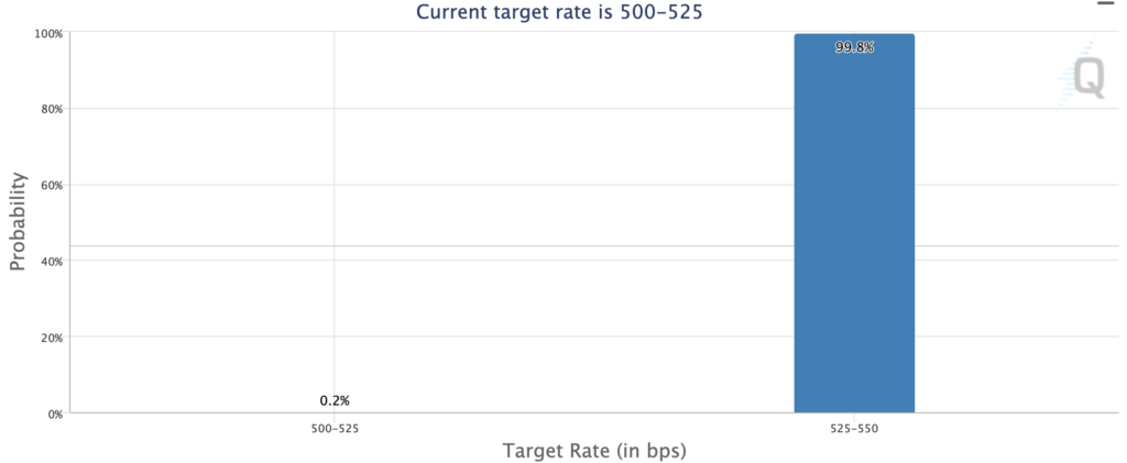 The current interest rate is at 500 to 525 bps, and the market has already fully priced in a 25 bps hike for next week with a probability of 99.8%.