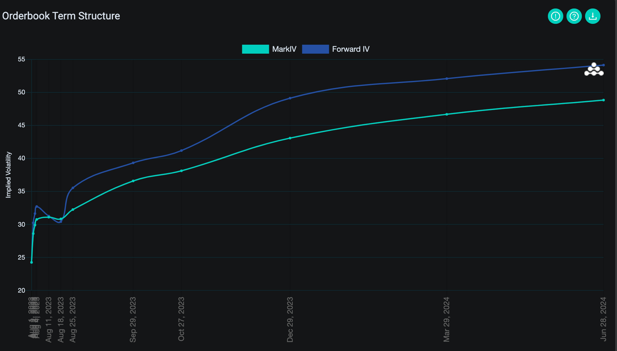 The volatility curve indicates that the market expects increased volatility and a substantial price surge towards the end of this year and into the next, potentially driven by factors such as the approval of a Blackrock spot ETF for Bitcoin and the upcoming Bitcoin Halving event. Many investors seem to be placing their bets on Bitcoinâs historical 4-year cycle, resulting in a steepening of the vol curve towards late 2023 and early 2024, signifying heightened expectations for larger price movements during that period.