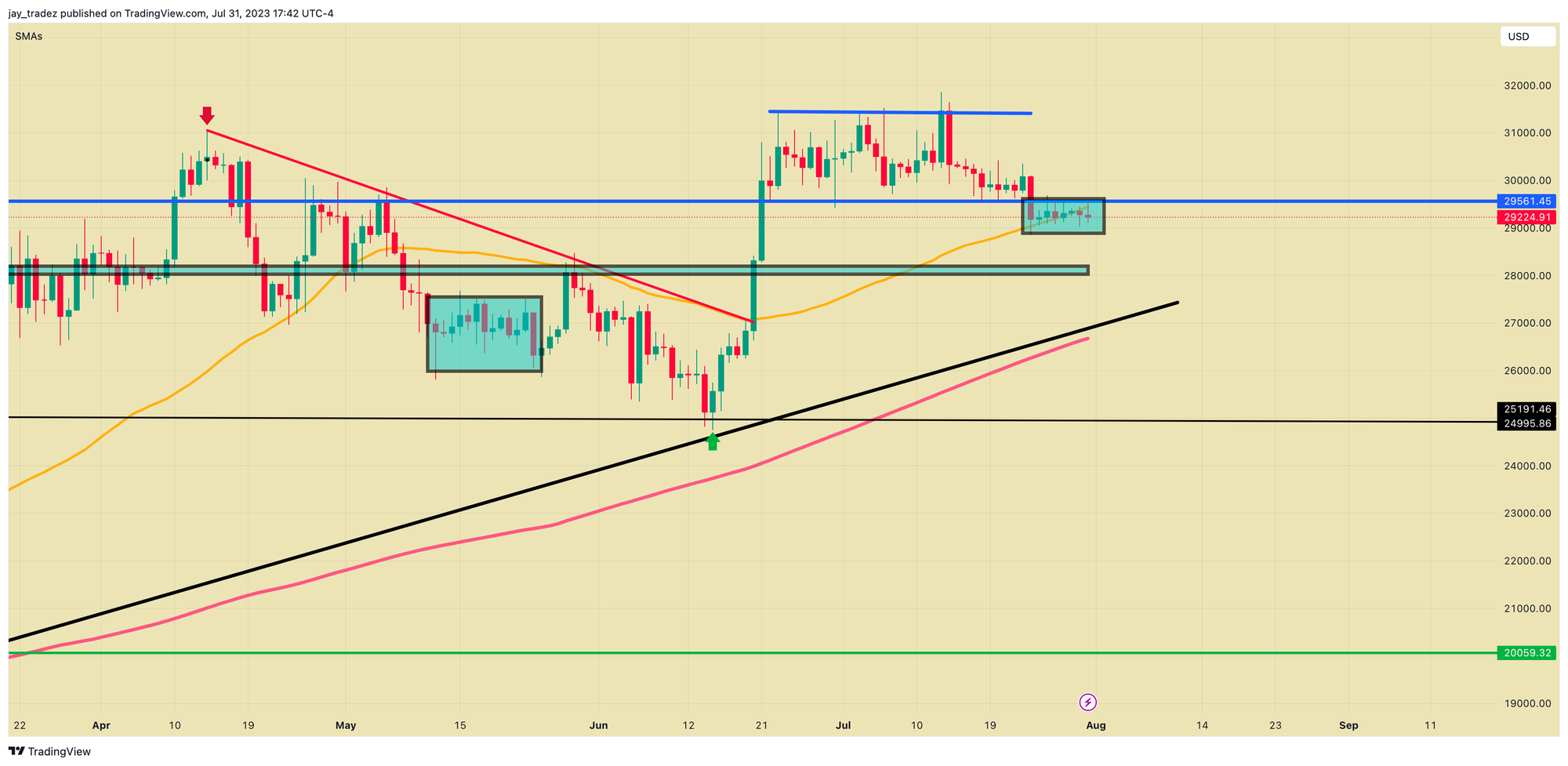 As weâve seen from past price movements, these tight ranges make it difficult to predict the future price direction. So, our approach for this week remains similar to last week: weâll be looking to trade on failed breakdowns or breakouts, as well as monitoring prices moving towards long-term support, like the $28,000 level. However, holding for the longer term could be risky. We previously discussed how to trade this in our previous post linked here. One update is that if BTC breaks down below $29,000 and then reclaims that level, it could present a good short-term trade opportunity. But, itâs essential to be cautious as there are multiple resistance levels above ($29,500 and $30,000).