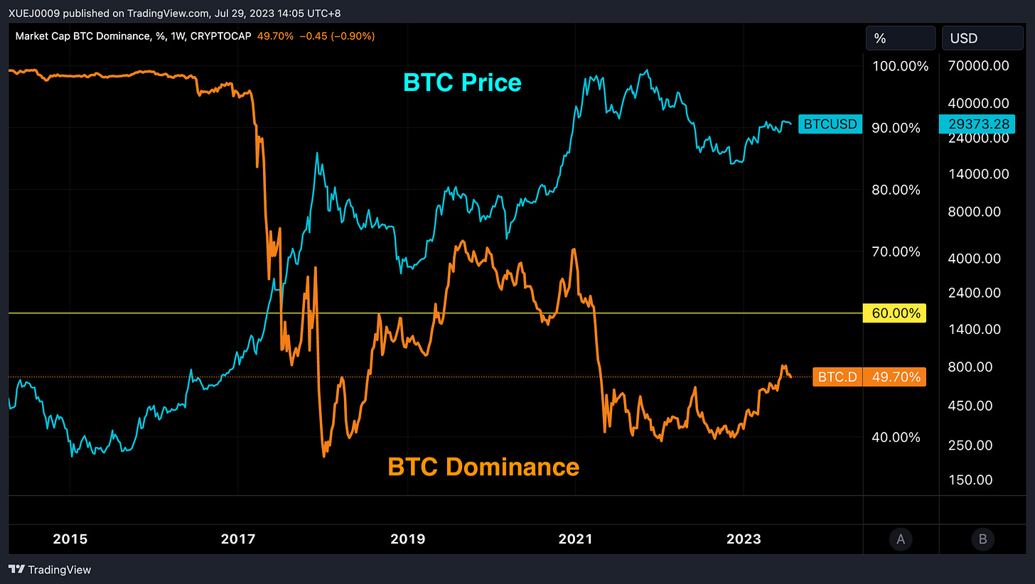 Based on historical data, Bitcoinâs market capitalization needs to surpass 60% to maintain a long-term bull market. However, at the moment, the current reading of 49.7% suggests that we might still be approximately 10% away from entering a long-term bull market if the current cycle continues to follow past patterns.
